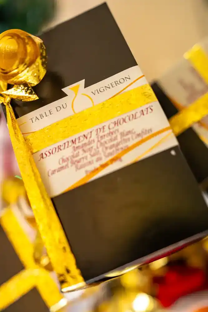 Il s’agit d’une boîte composée de produits régionaux fournis par le créateur et fabricant Les Santolines, à Gonfaron. L’on y retrouve notamment des oranges confites, des olivettes et du caramel beurre salé.