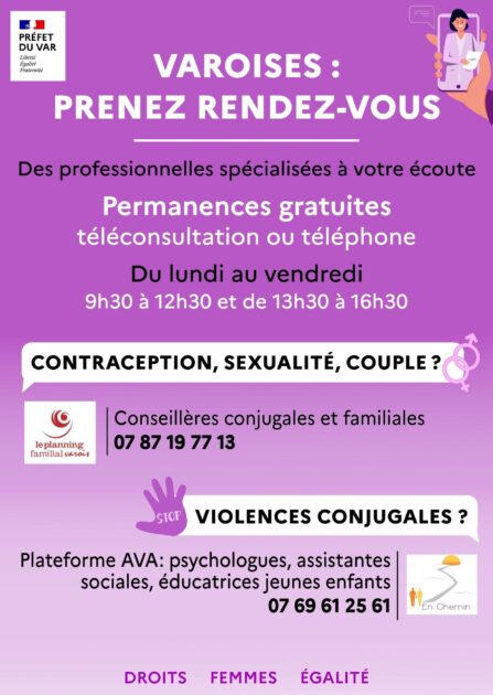 Pour les femmes dans le #Var : permanences gratuites en téléconsultation ou appel téléphoniques, sur rendez-vous du lundi au vendredi, de 9h30 à 16h30.