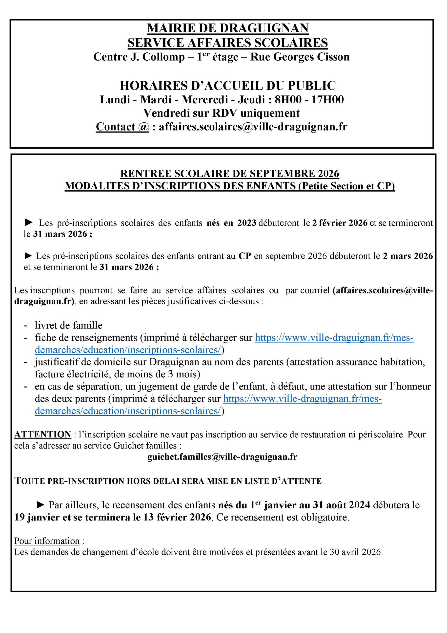 Mais si vous résidez à Draguignan et que votre enfant est né entre le 1er janvier 2023 et le 31 août 2023, son recensement est obligatoire et devra être fait auprès du Service Affaires Scolaires impérativement avant le 15 février 2025.