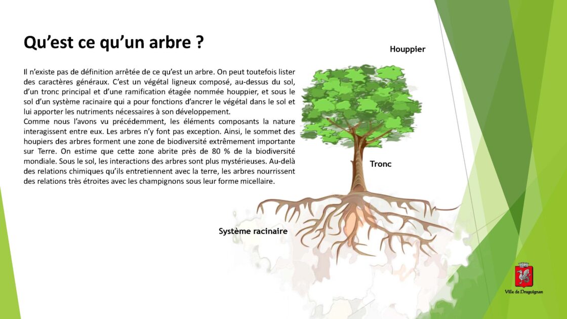 Il n’existe pas de définition arrêtée de ce qu’est un arbre. On peut toutefois lister des caractères généraux. C’est un végétal ligneux composé, au-dessus du sol, d’un tronc principal et d’une ramification étagée nommée houppier, et sous le sol d’un système racinaire qui a pour fonctions d’ancrer le végétal dans le sol et lui apporter les nutriments nécessaires à son développement.