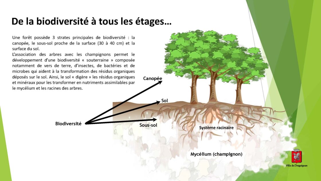 L’association des arbres avec les champignons permet le développement d’une biodiversité « souterraine » composée notamment de vers de terre, d’insectes, de bactéries et de microbes qui aident à la transformation des résidus organiques déposés sur le sol. Ainsi, le sol « digère » les résidus organiques et minéraux pour les transformer en nutriments assimilables par le mycélium et les racines des arbres.