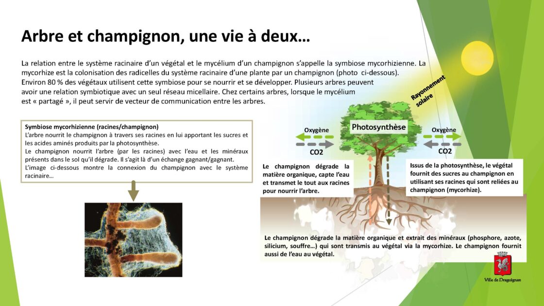 La relation entre le système racinaire d’un végétal et le mycélium d’un champignon s’appelle la symbiose mycorhizienne. La mycorhize est la colonisation des radicelles du système racinaire d’une plante par un champignon (photo ci-dessous). Environ 80 % des végétaux utilisent cette symbiose pour se nourrir et se développer. Plusieurs arbres peuvent