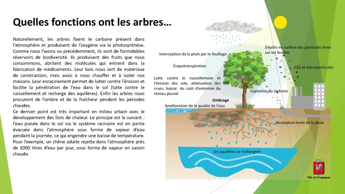 Naturellement, les arbres fixent le carbone présent dans l’atmosphère et produisent de l’oxygène via la photosynthèse. Comme nous l’avons vu précédemment, ils sont de formidables réservoirs de biodiversité. Ils produisent des fruits que nous consommons, abritent des molécules qui entrent dans la fabrication de médicaments. Leur bois nous sert de matériaux de construction, mais aussi à nous chauffer et à isoler nos maisons. Leur enracinement permet de lutter contre l’érosion et facilite la pénétration de l’eau dans le sol (lutte contre le ruissellement et recharge des aquifères). Enfin les arbres nous procurent de l’ombre et de la fraîcheur pendant les périodes chaudes.