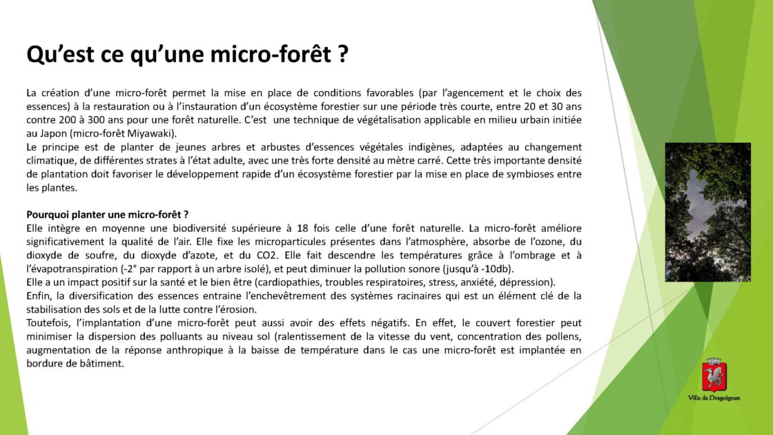 La création d’une micro-forêt permet la mise en place de conditions favorables (par l’agencement et le choix des essences) à la restauration ou à l’instauration d’un écosystème forestier sur une période très courte, entre 20 et 30 ans contre 200 à 300 ans pour une forêt naturelle. C’est une technique de végétalisation applicable en milieu urbain initiée au Japon (micro-forêt Miyawaki).