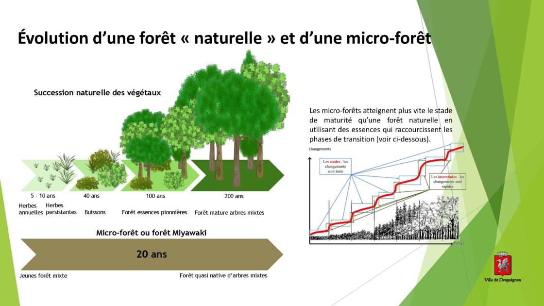 Les micro-forêts atteignent plus vite le stade de maturité qu’une forêt naturelle en utilisant des essences qui raccourcissent les phases de transition (voir l’illustration).