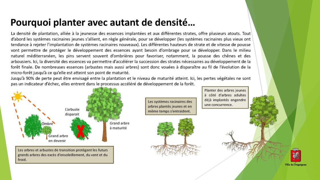 La densité de plantation, alliée à la jeunesse des essences implantées et aux différentes strates, offre plusieurs atouts. Tout d’abord les systèmes racinaires jeunes s’allient, en règle générale, pour se développer (les systèmes racinaires plus vieux ont tendance à rejeter l’implantation de systèmes racinaires nouveaux). Les différentes hauteurs de strate et de vitesse de pousse vont permettre de protéger le développement des essences ayant besoin d’ombrage pour se développer.