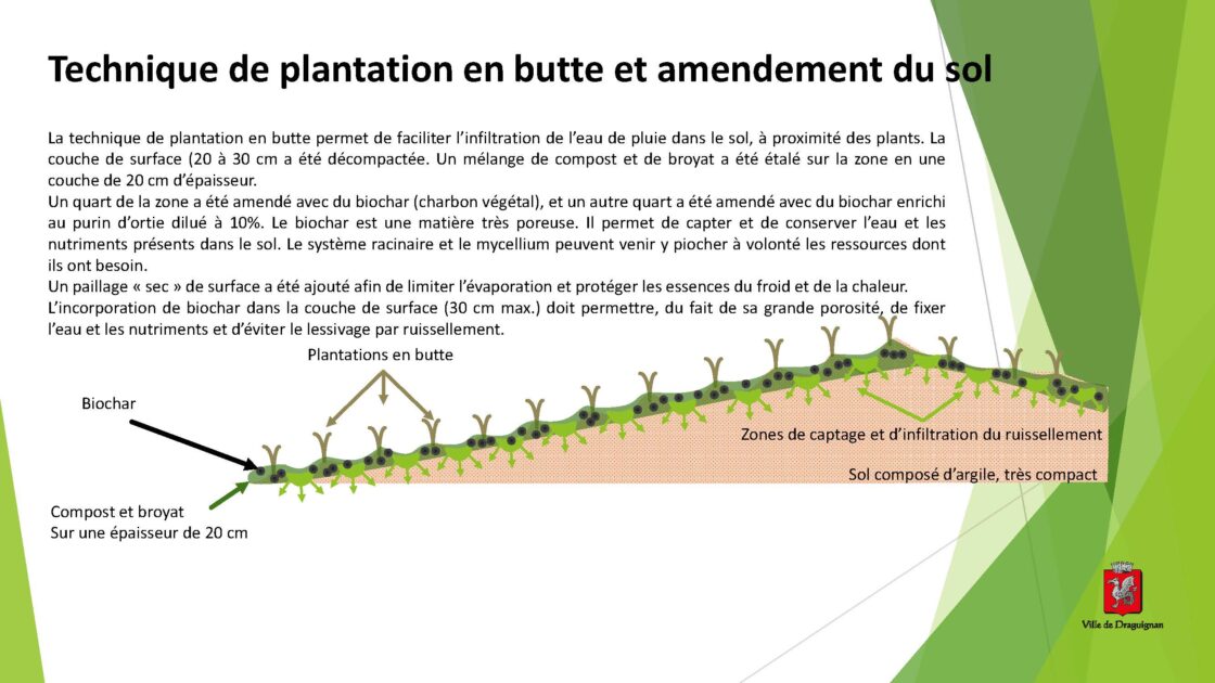 La technique de plantation en butte permet de faciliter l’infiltration de l’eau de pluie dans le sol, à proximité des plants. La couche de surface (20 à 30 cm a été décompactée. Un mélange de compost et de broyat a été étalé sur la zone en une couche de 20 cm d’épaisseur.