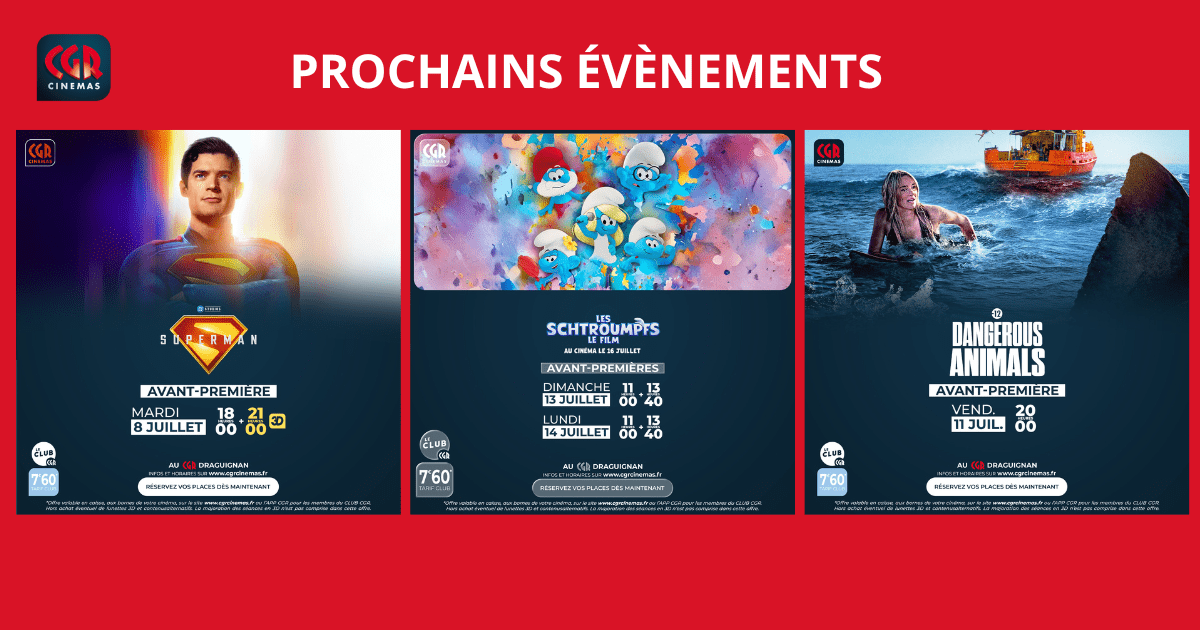 Cette semaine, préparez-vous à une avalanche de nouveautés et d’émotions fortes au CGR Draguignan, avec une programmation qui ravira petits et grands du 2 au 8 juillet ! Avant-première exceptionnelle – SUPERMANUn Superman moderne, humain et inspirant, signé James Gunn, avec David Corenswet dans le rôle du héros mythique. Mardi 2 juillet à 18h en 2D & 21h en … Lire plus