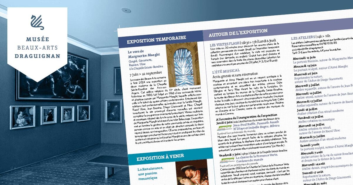 Retrouvez la programmation des événements du musée des Beaux-Arts à consulter et à télécharger : Version à télécharger : Autour de l’exposition Le vœu de Marguerite Maeght Les ateliers du mercredi À destination des adultes et familles, de 14h à 16h, réservation conseillée. 3 € enfant / 6 € adulte Le 5 juin : la représentation de l’été … Lire plus