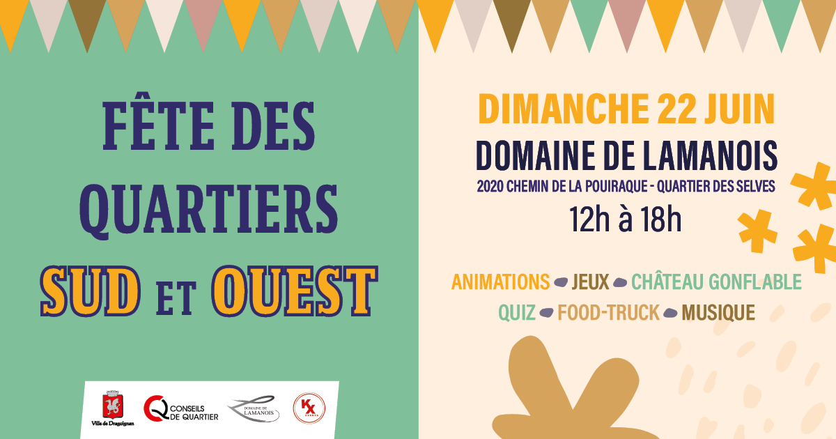 Rendez-vous le dimanche 11 juin, de 12h à 18h au domaine de Lamanois pour la Fête des quartiers Sud et Ouest. Un après-midi festif vous attend avec apéritif, musique, jeux et loto géant. Renseignements et réservations gratuites sur https://tinyurl.com/yc7aky7s ou en écrivant à sud@ville-draguignan.fr À savoir, les animaux ne sont pas admis pour des raisons de sécurité car de … Lire plus