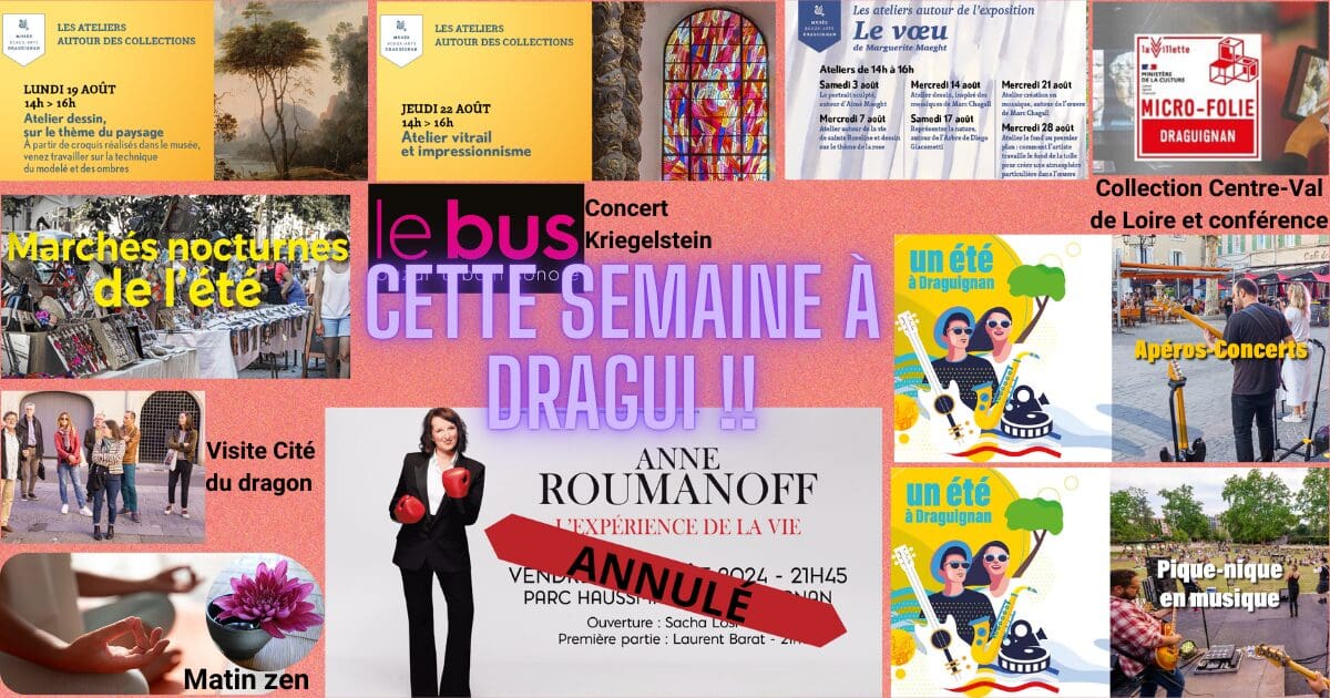 Les animations estivales reviennent avec au programme cette semaine : + d’infos sur https://mediatheques.dracenie.com/cms/articleview/id/1861 + d’infos sur https://agenda.ville-draguignan.fr/evenements/pique-nique-en-musique-2/ + d’infos sur https://agenda.ville-draguignan.fr/evenements/le-bus-felix-jazz-band/ + d’infos sur https://mba-draguignan.fr/events/lete-au-musee-atelier-vitrail/ + d’infos sur https://agenda.ville-draguignan.fr/evenements/presentation-de-la-saison-culturelle-2024-2025-de-dpva/ + d’infos sur https://agenda.ville-draguignan.fr/evenements/marche-nocturne-2/ + d’infos sur https://agenda.ville-draguignan.fr/evenements/apero-concert-2/ + d’infos sur https://agenda.ville-draguignan.fr/evenements/le-bus-megbreakfast/ + d’infos sur https://agenda.ville-draguignan.fr/evenements/grand-prix-dete-tcd/ + d’infos sur https://agenda.ville-draguignan.fr/evenements/le-bus-the-crabeaters/ Retrouvez tout le programme des … Lire plus